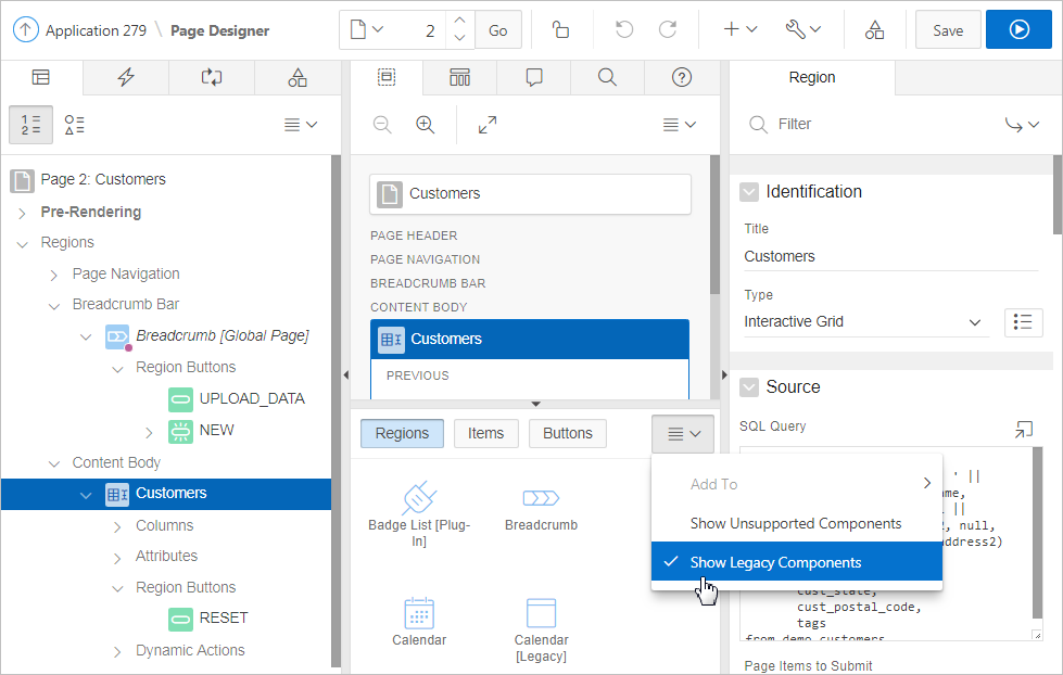 View legacy and unsupported components in the Page Designer gallery by selecting the Gallery Menu and then Show Legacy Components.