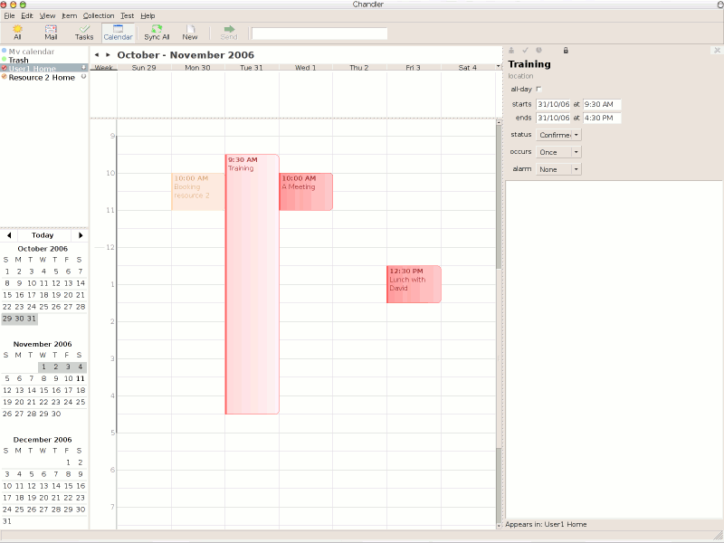 Chandler describes itself as 'an experimentally usable calendar', and it certainly feels that way. It also will only synchronise to the CalDAV server either when you press the "Sync" button or with a default frequency of quarter-hourly. This is quite different to the other clients I have used which all aggressively push new and changed items to the server as soon as possible, but which may be lazy about fetching updates.