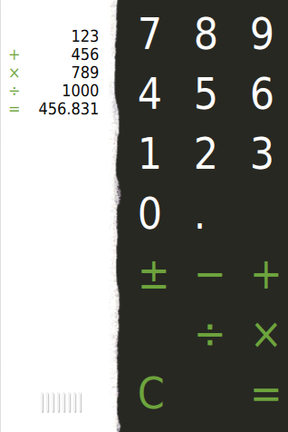 Grid { columns: 3 columnSpacing: 32 rowSpacing: 16 signal buttonPressed Button { text: "7" } Button { text: "8" } Button { text: "9" } Button { text: "4" } Button { text: "5" } Button { text: "6" } Button { text: "1" } Button { text: "2" } Button { text: "3" } Button { text: "0" } Button { text: "."; dimmable: true } Button { text: " " } Button { text: "±"; color: "#6da43d"; operator: true; dimmable: true } Button { text: "−"; color: "#6da43d"; operator: true; dimmable: true } Button { text: "+"; color: "#6da43d"; operator: true; dimmable: true } Button { text: "√"; color: "#6da43d"; operator: true; dimmable: true } Button { text: "÷"; color: "#6da43d"; operator: true; dimmable: true } Button { text: "×"; color: "#6da43d"; operator: true; dimmable: true } Button { text: "C"; color: "#6da43d"; operator: true } Button { text: " "; color: "#6da43d"; operator: true } Button { text: "="; color: "#6da43d"; operator: true; dimmable: true } }