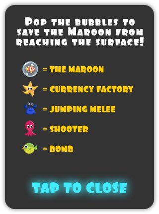 Tapping the button initiates a countdown timer that triggers the creation of the game canvas by using the GameCanvas type. Another Timer type spawns mobs of fish inside bubbles that the players must free before they reach the surface. The players can tap on the screen to open a menu where they can buy different types of weapons (melee, ranged, and bombs) to burst the bubbles.