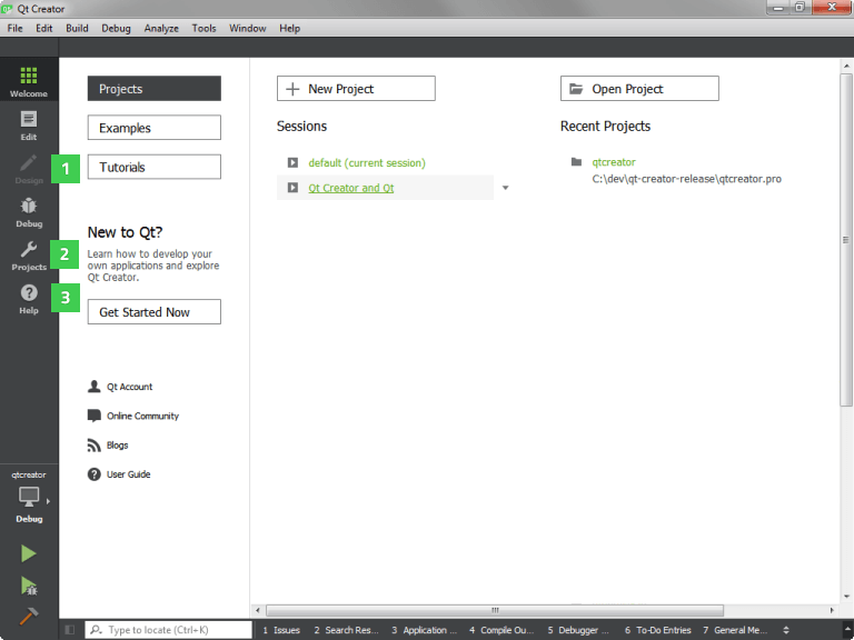 Qt Creator provides you with tools for accomplishing your tasks throughout the whole application development life-cycle, from creating a project to deploying the application on the target platforms. Qt Creator automates some tasks, such as creating projects, by providing wizards that guide you step-by-step through the project creation process, create the necessary files, and specify settings depending on the choices you make. Also, it speeds up some tasks, such as writing code, by offering semantic highlighting, checking code syntax, code completion, refactoring actions, and other useful features.